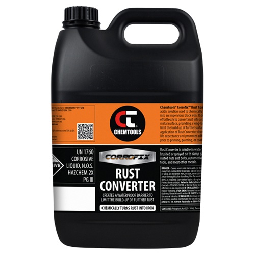 Corrofix Rust Converter 5L is a professional‑grade chemical treatment that neutralises rust and transforms corroded iron and steel into a stable, inert surface ready for priming and painting. Designed for mechanics, builders and maintenance teams, CT‑RC‑5L bonds with rust to stop further corrosion and improve coating adhesion. Easy to apply and formulated for lasting protection, it reduces prep time and extends the life of metal components.